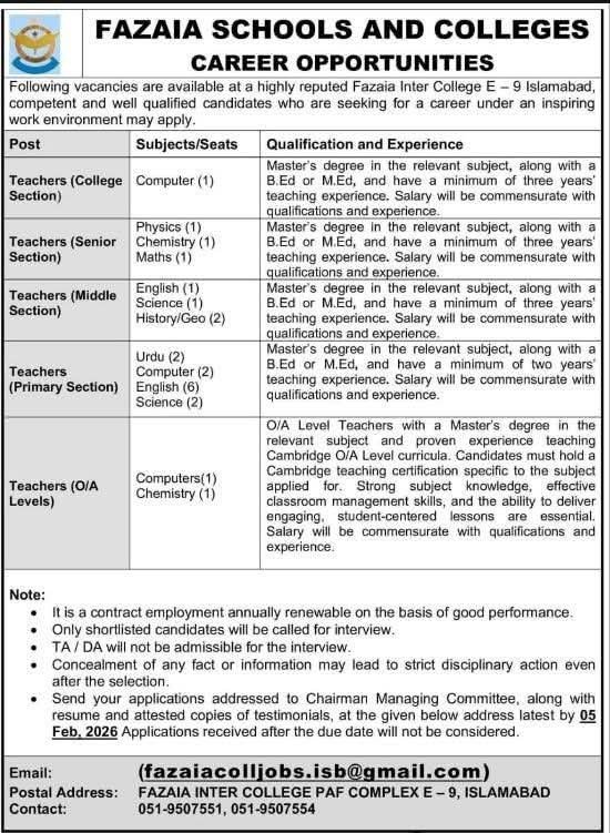 If you are a passionate educator looking to grow your career in a disciplined, reputable, and professional academic environment, Fazaia Degree College (PAF) E-9 Campus offers an excellent opportunity to take the next step. Known for its commitment to quality education and character building, the college has announced multiple teaching vacancies for qualified candidates.