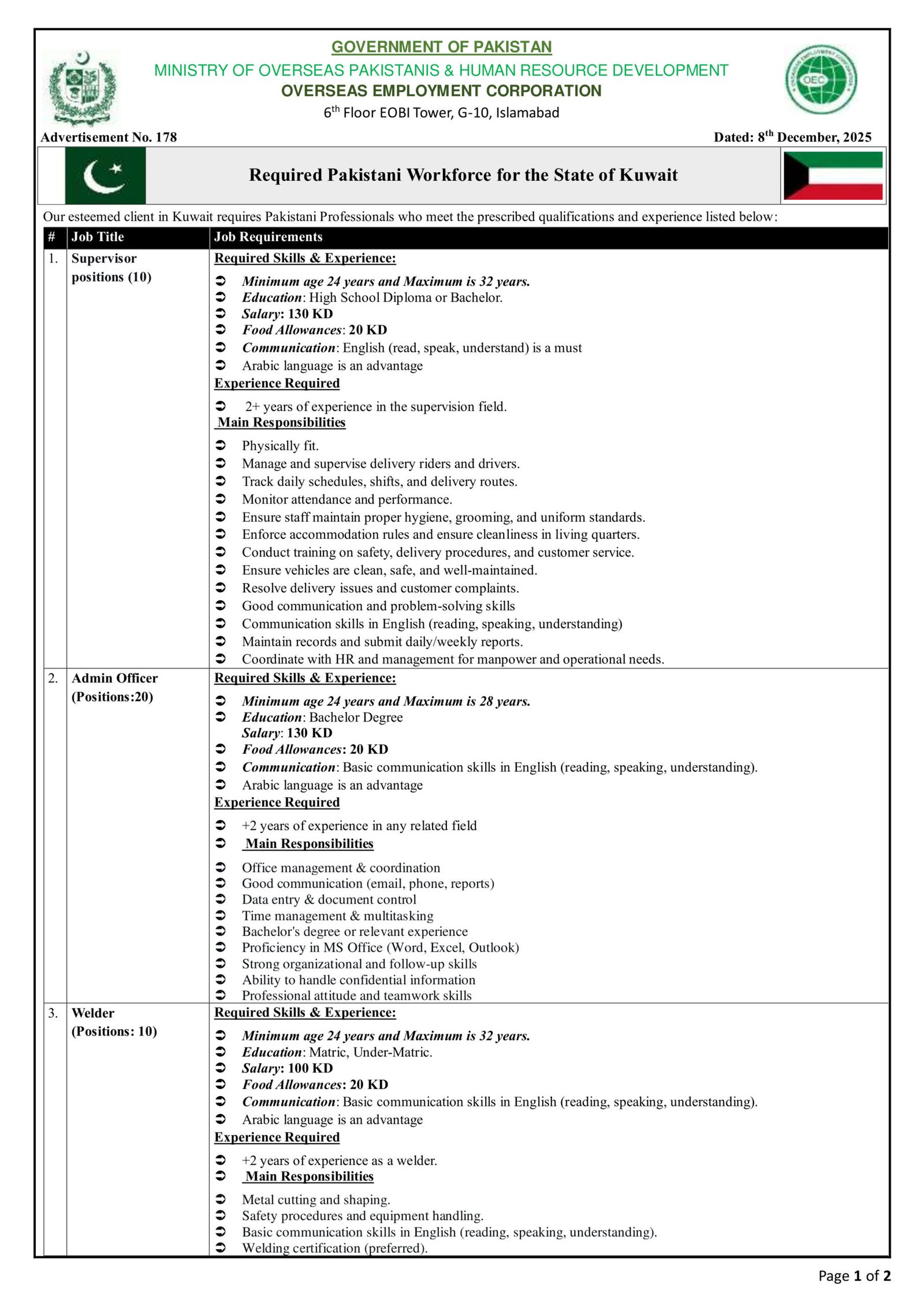 The Overseas Employment Corporation (OEC), operating under the Ministry of Overseas Pakistanis & Human Resource Development, Government of Pakistan, has officially announced a large number of overseas jobs for Pakistani professionals and skilled workers in the State of Kuwait. These recruitment drive is a best opportunity for individuals seeking secure, government-approved employment in abroad with attractive salaries and multiple benefits under Kuwait Labor Laws.