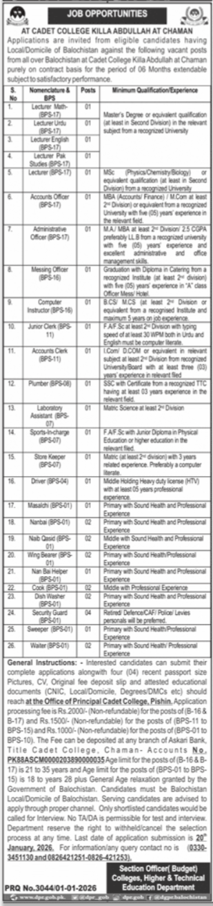 Latest Lecturer Jobs 2026 Announced At Cadet College Killa Abdullah Chaman Balochistan January Latest
