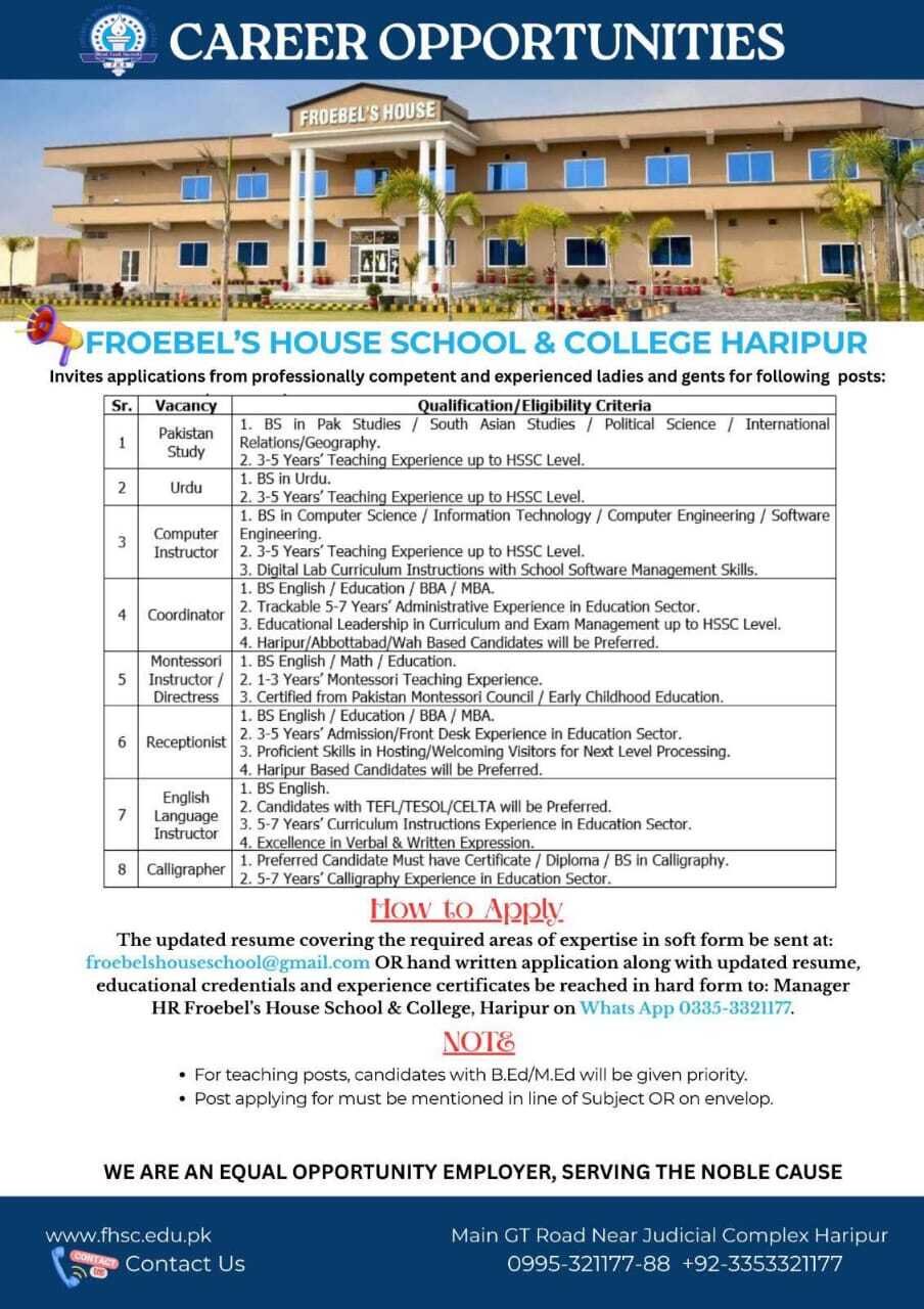 Froebel’s House School & College Haripur has announced new teaching positions for qualified and experienced candidates under its General Recruitment Phase.