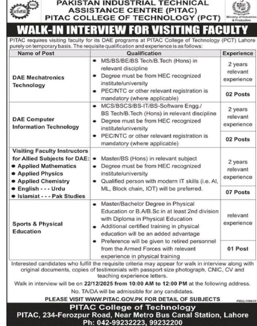 Lecturer Visiting Faculty Instructor Jobs In PITAC College Of Technology Teachers Jobs 2025 December Latest