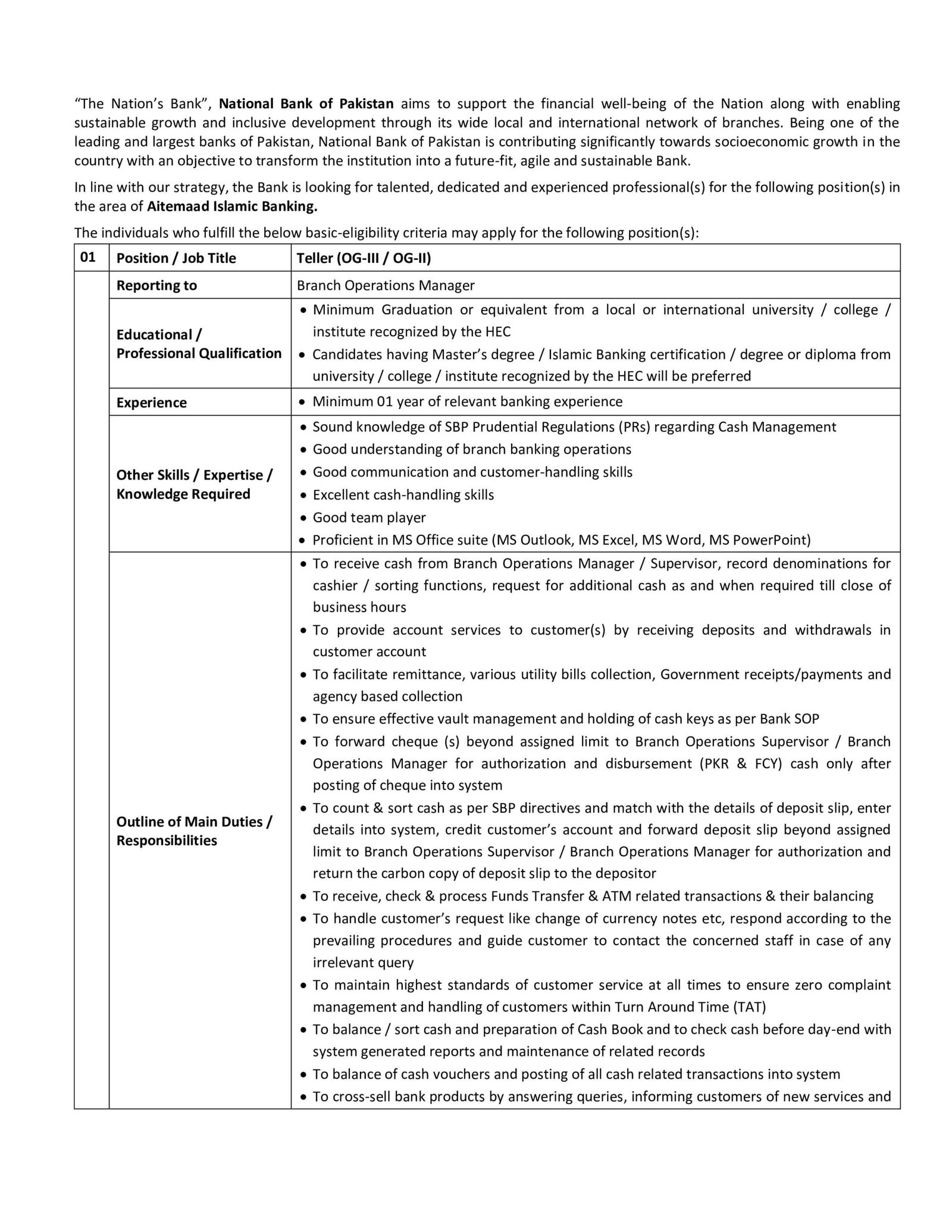 National Bank Of Pakistan NBP Teller OG-III January Jobs 2026 Apply Online