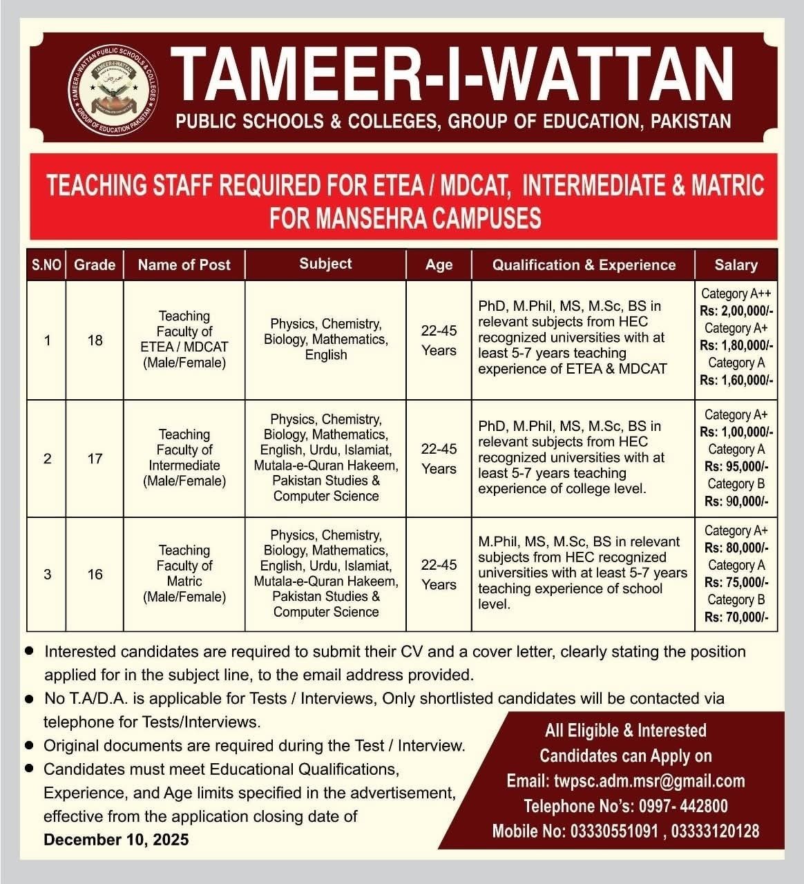 Tameer I Wattan School And Colleges Lecturers And SST Teachers Jobs 2025 December Latest