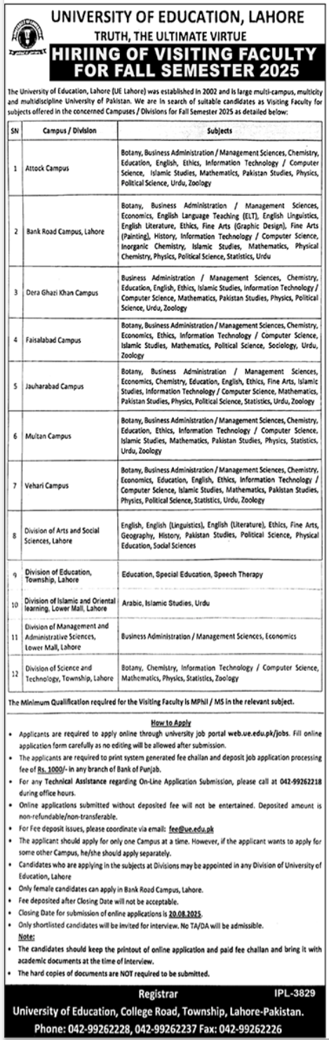 Visiting Faculty at University of Education Lahore For Teachers